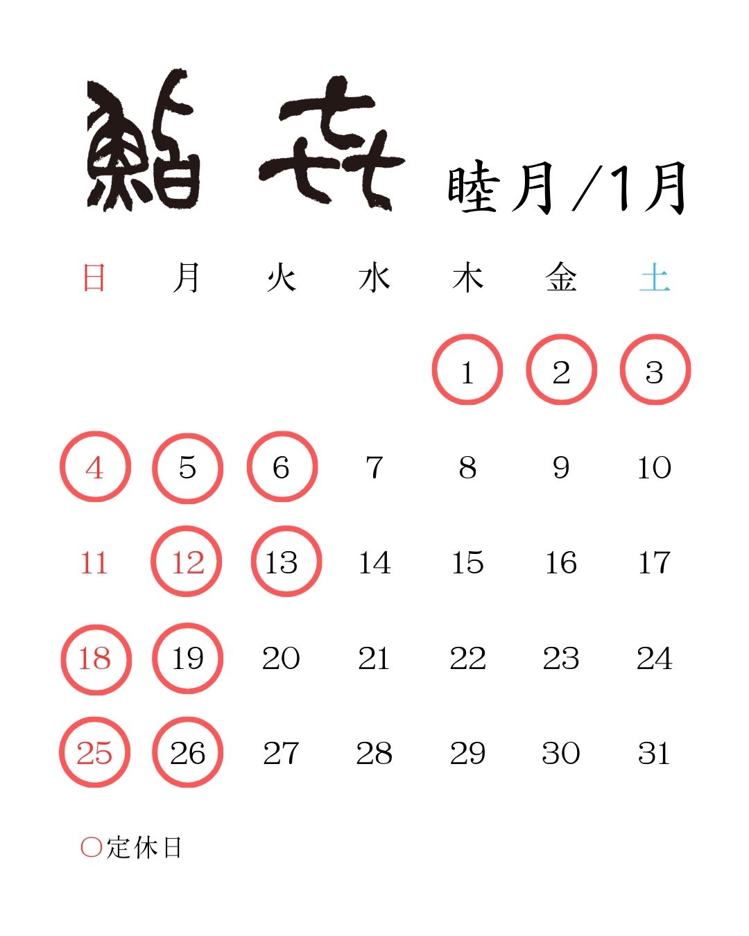1月の営業日